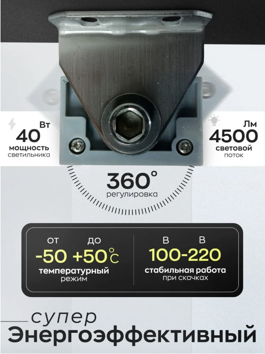 Представляем мощное светодиодное освещение! С ярким потоком света 4500 Лм и цветовой температурой от 4000K до 6500K идеально подчеркнет ваш интерьер. Запечатлейте качество Taiwan – знаменитые светодиоды Epistar обеспечат равномерный свет без мерцания (<5%). При пыле-водозащите IP67 и антивандальном корпусе из алюминия это решение надежно и долговечно. Удобство установки обеспечивает винтовое крепление, регулировка направления света на 360 градусов и поворотный кронштейн.